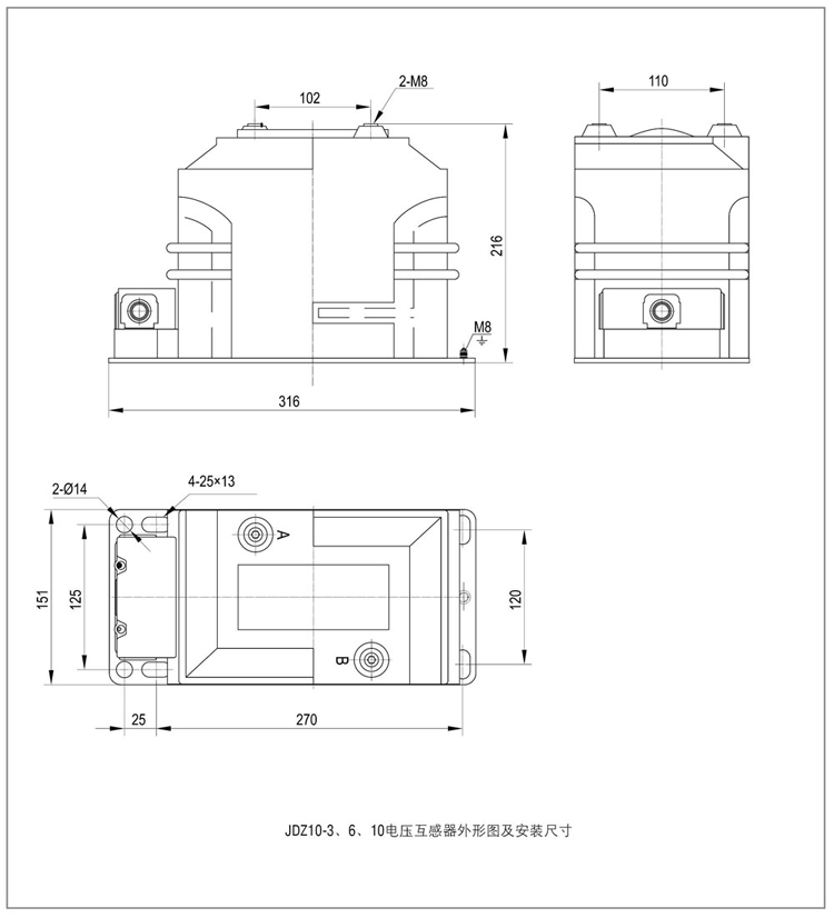 | 本系列電壓互感器為支柱式結(jié)構(gòu),采用環(huán)氧樹脂全封閉環(huán)氧澆注,耐污染及潮濕,也適用于熱帶地區(qū)使用,互感器不需要特別維護(hù),只需定期地清除表面污物。互感器二次出線端子處安裝接線端子盒,端子盒正面和側(cè)面各有一個(gè)孔與出線端配合供引出接線用,安全可靠。產(chǎn)品底板上有接地螺栓及供安裝用的六個(gè)安裝孔。 | ||||||||||||||||||||||||||||||